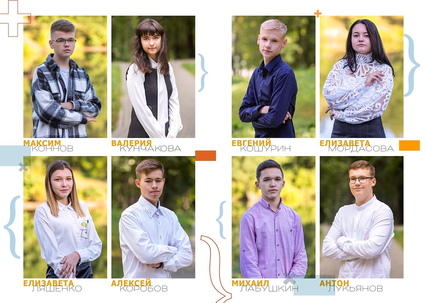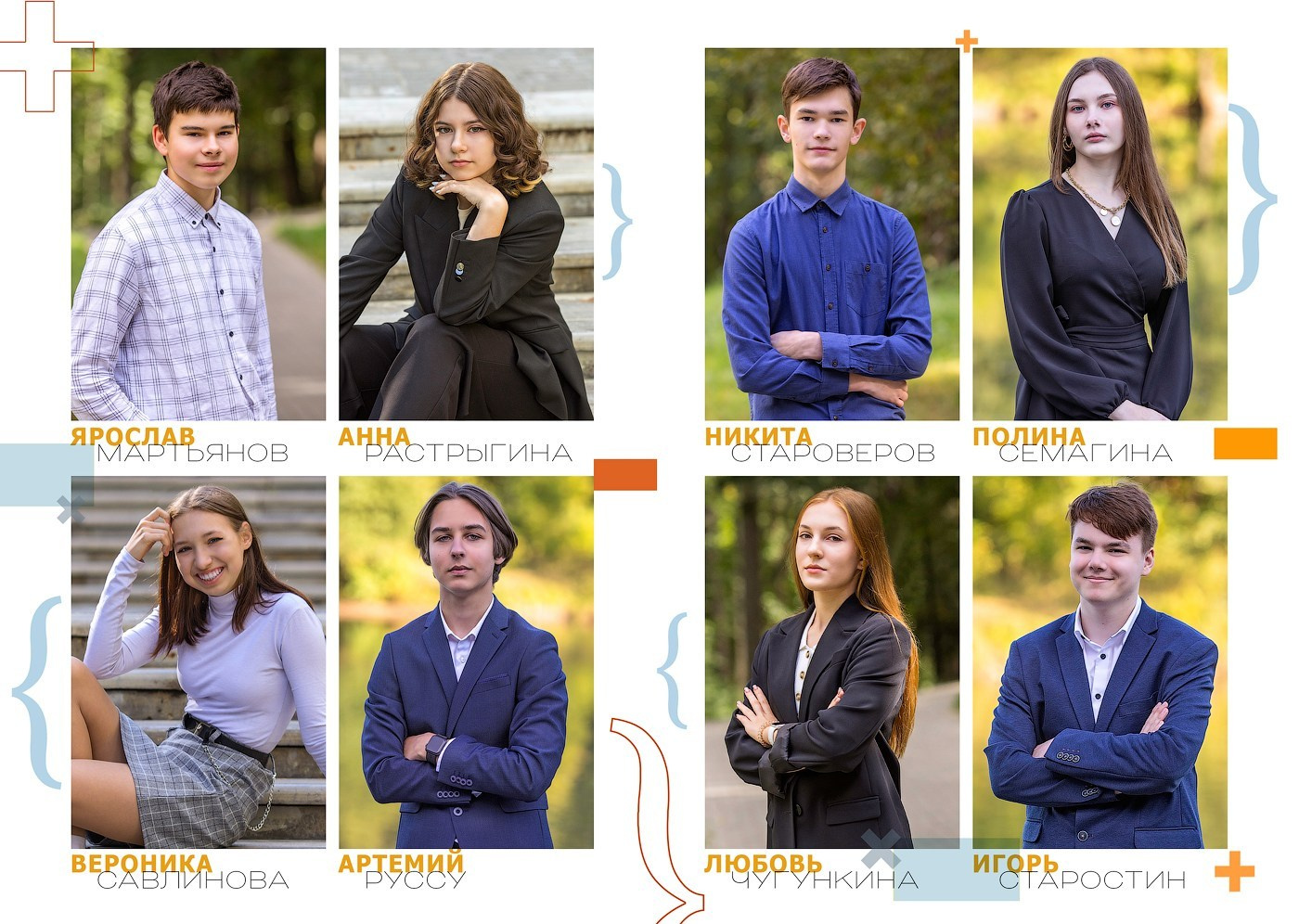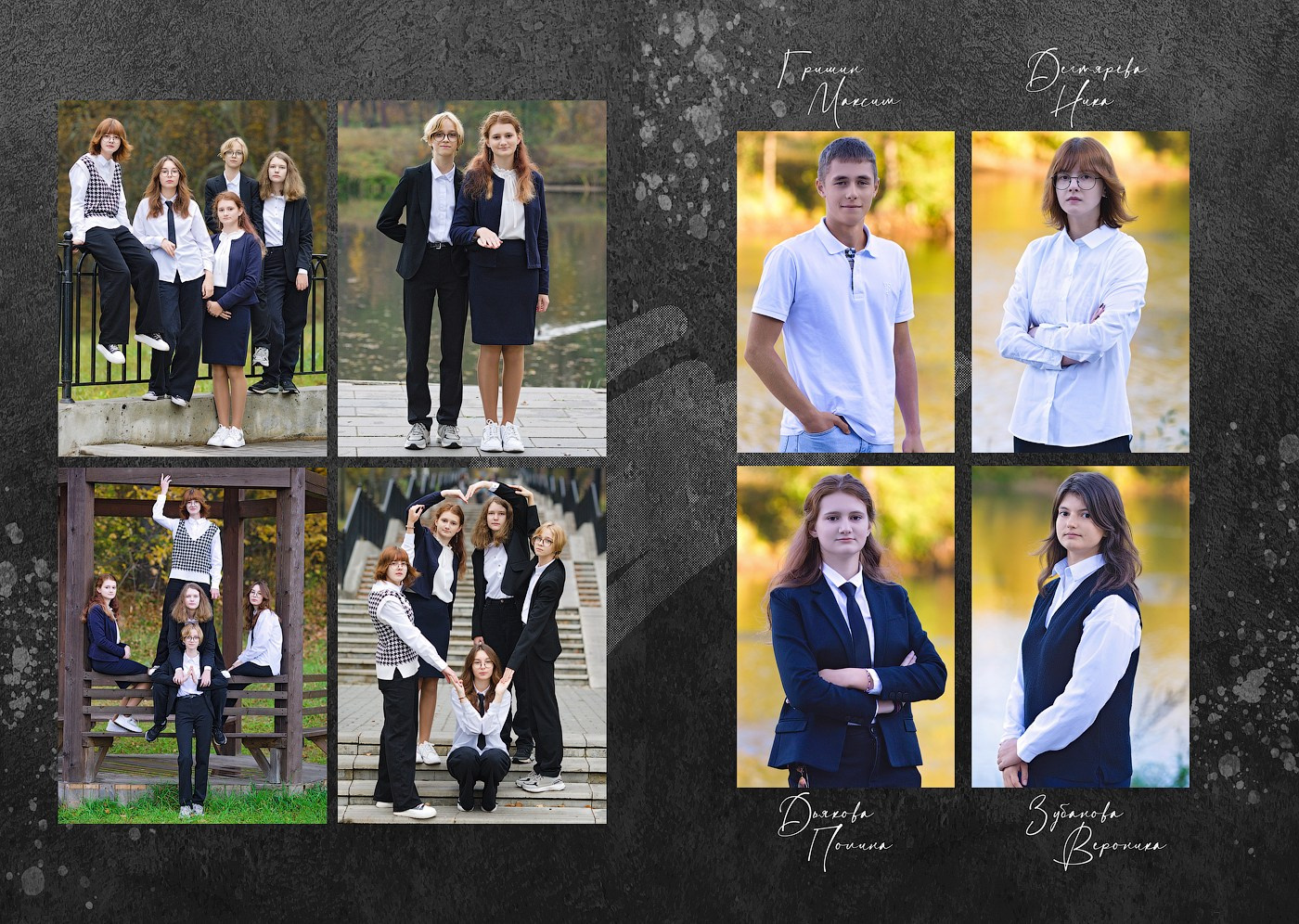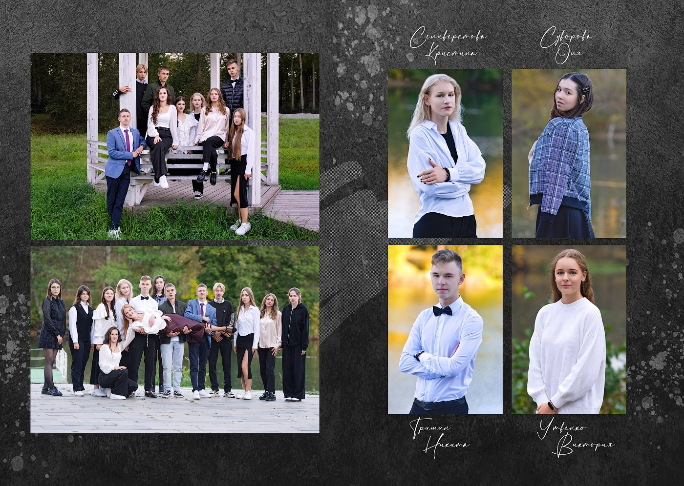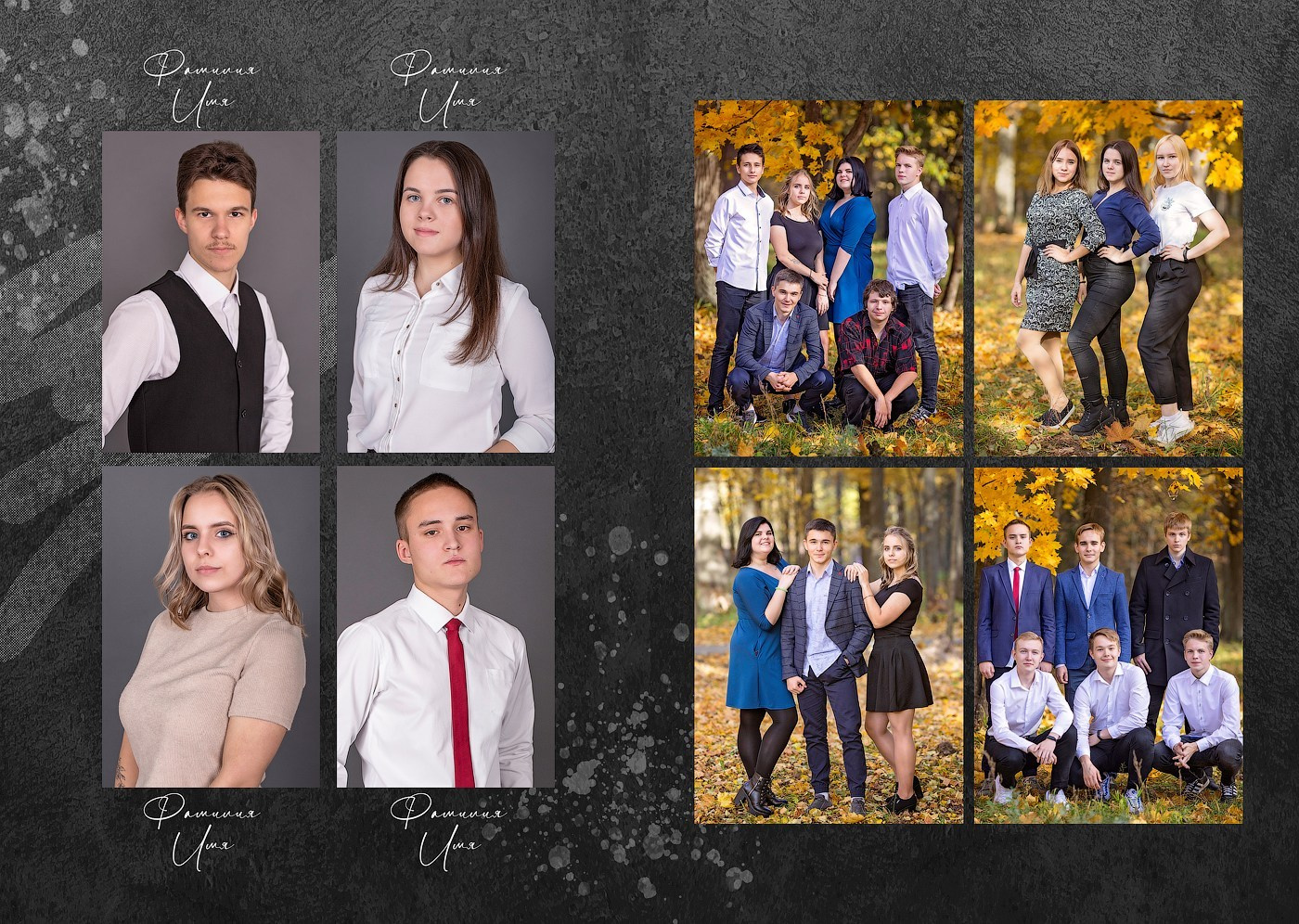 (портреты выпускников по 4 шт. на странице идут не вперемешку с групповыми фотографиями, в начале подряд — представлена часть разворотов в качестве примера)