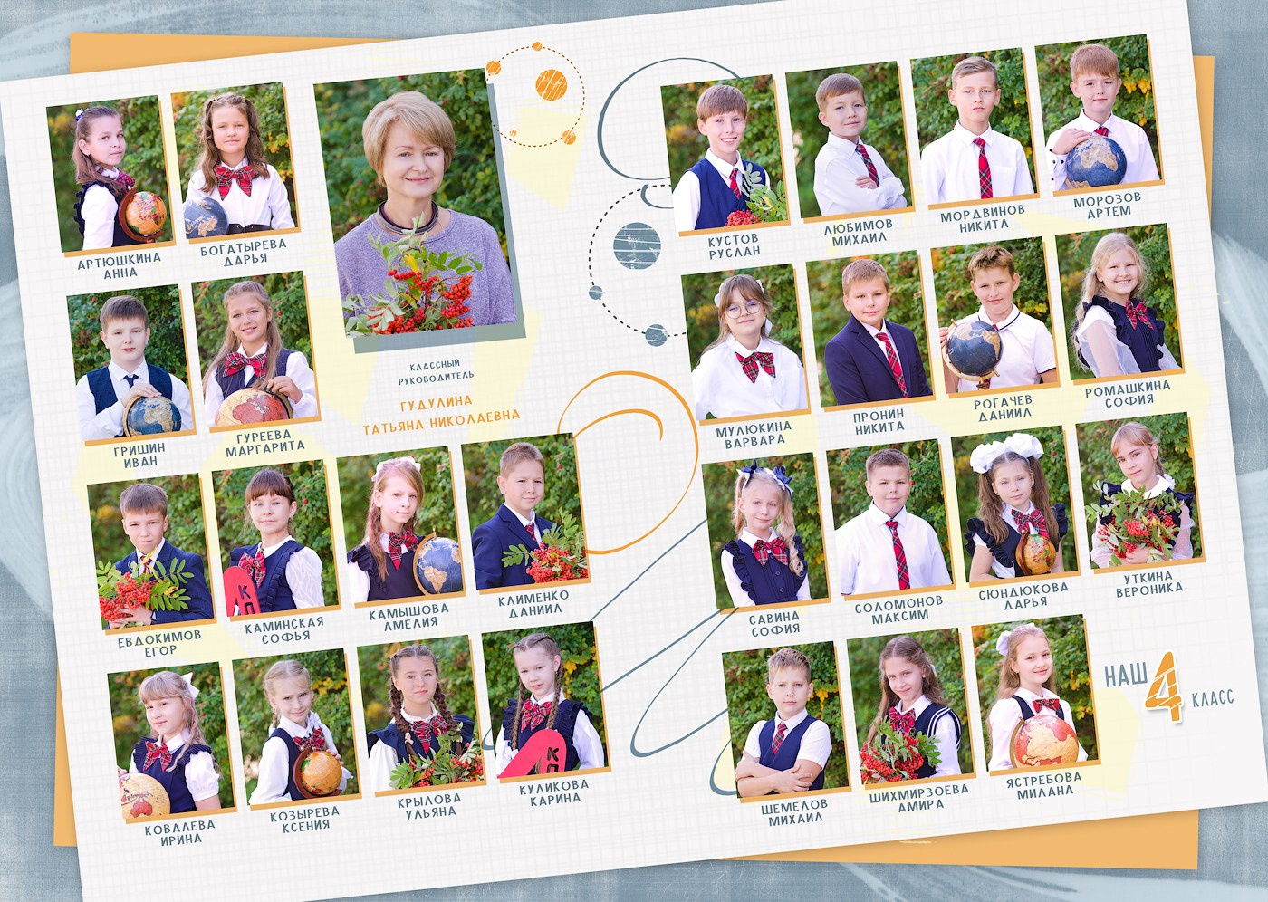 - Общий альбом, одинаковый для всех, отличие в крупном индивидуальном портрете выпускника на первом развороте.