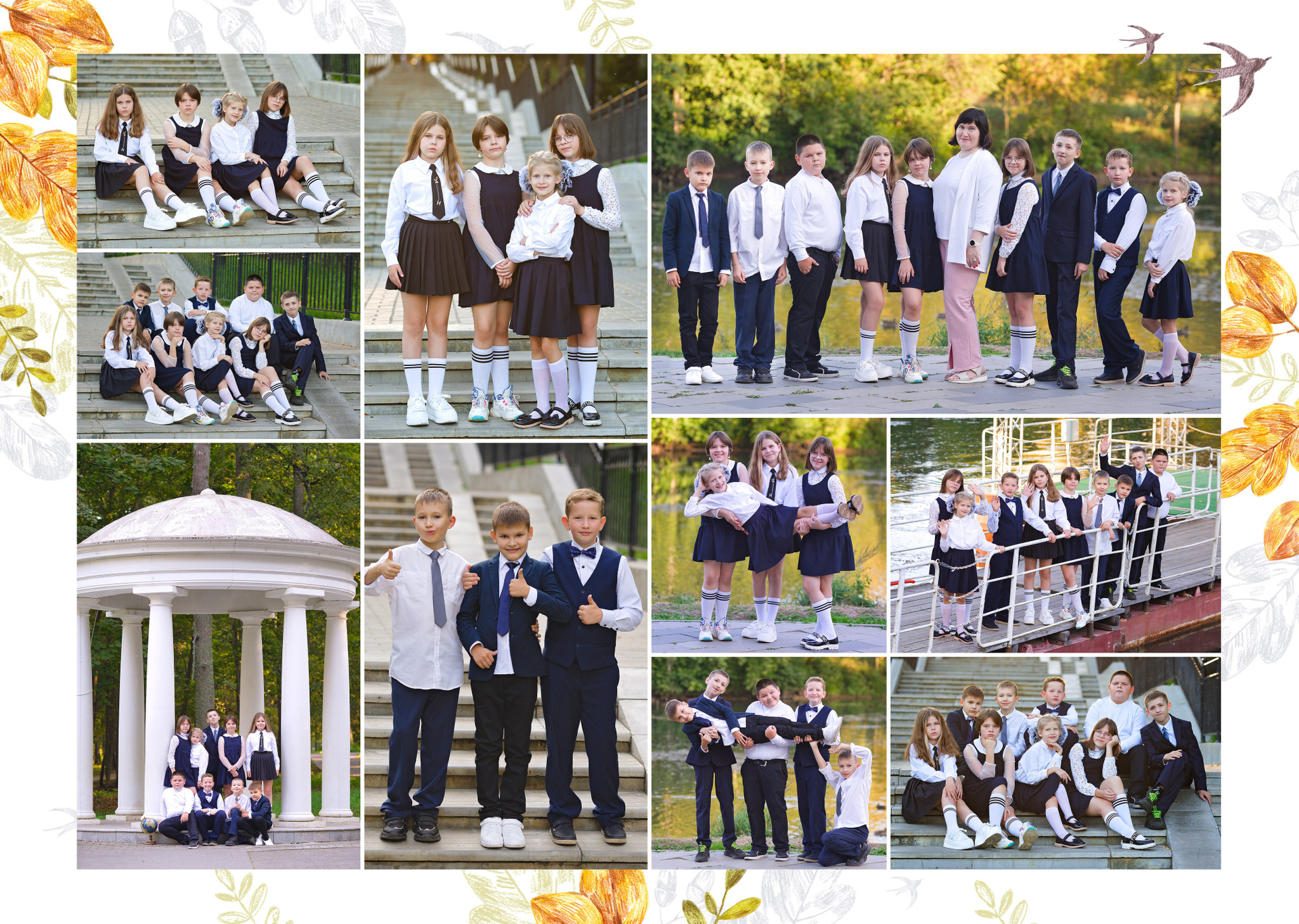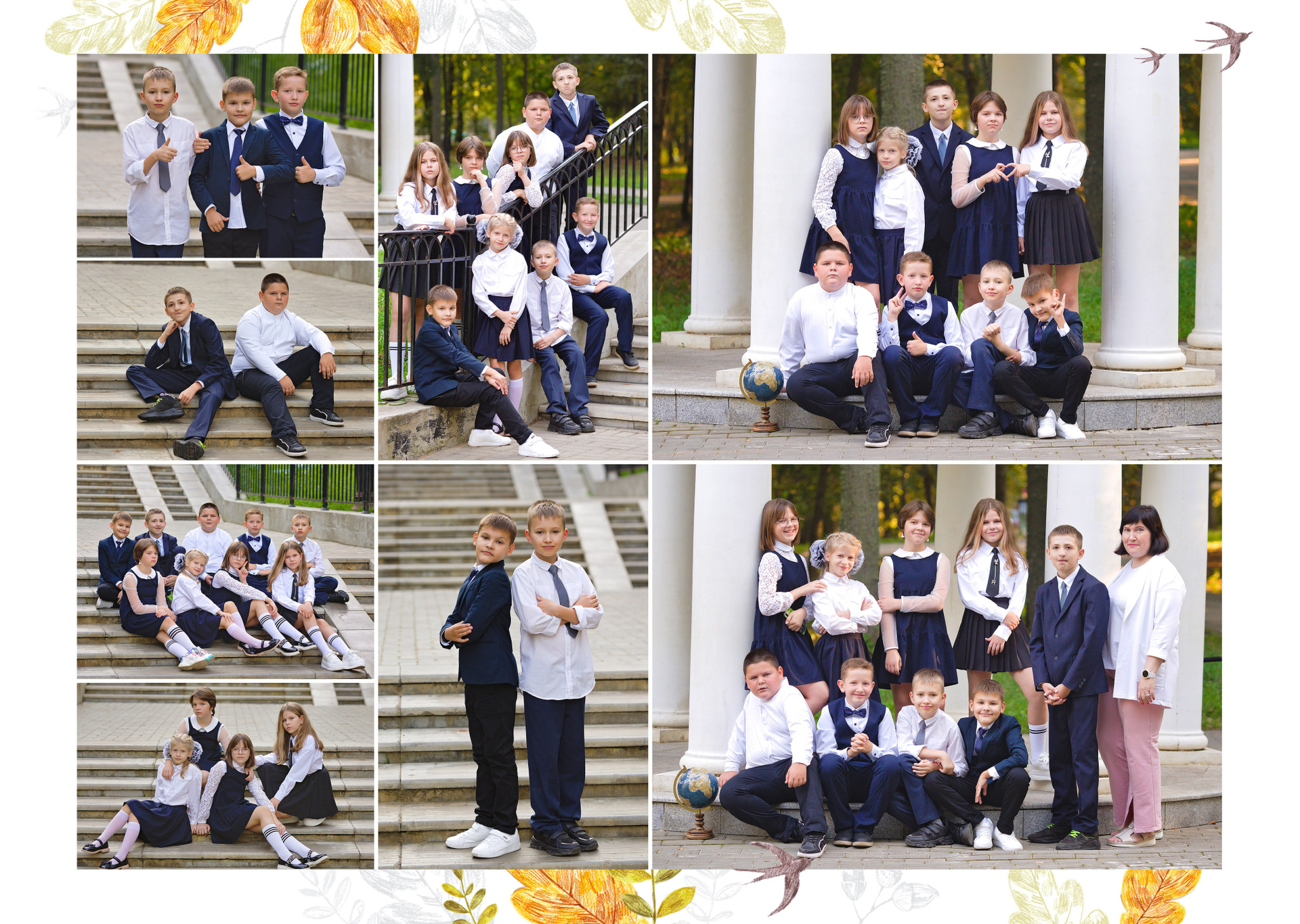 - Добавить общий разворот с групповыми фотографиями детей (одинаковый для всех, можно фото из архива класса) + 300 р.